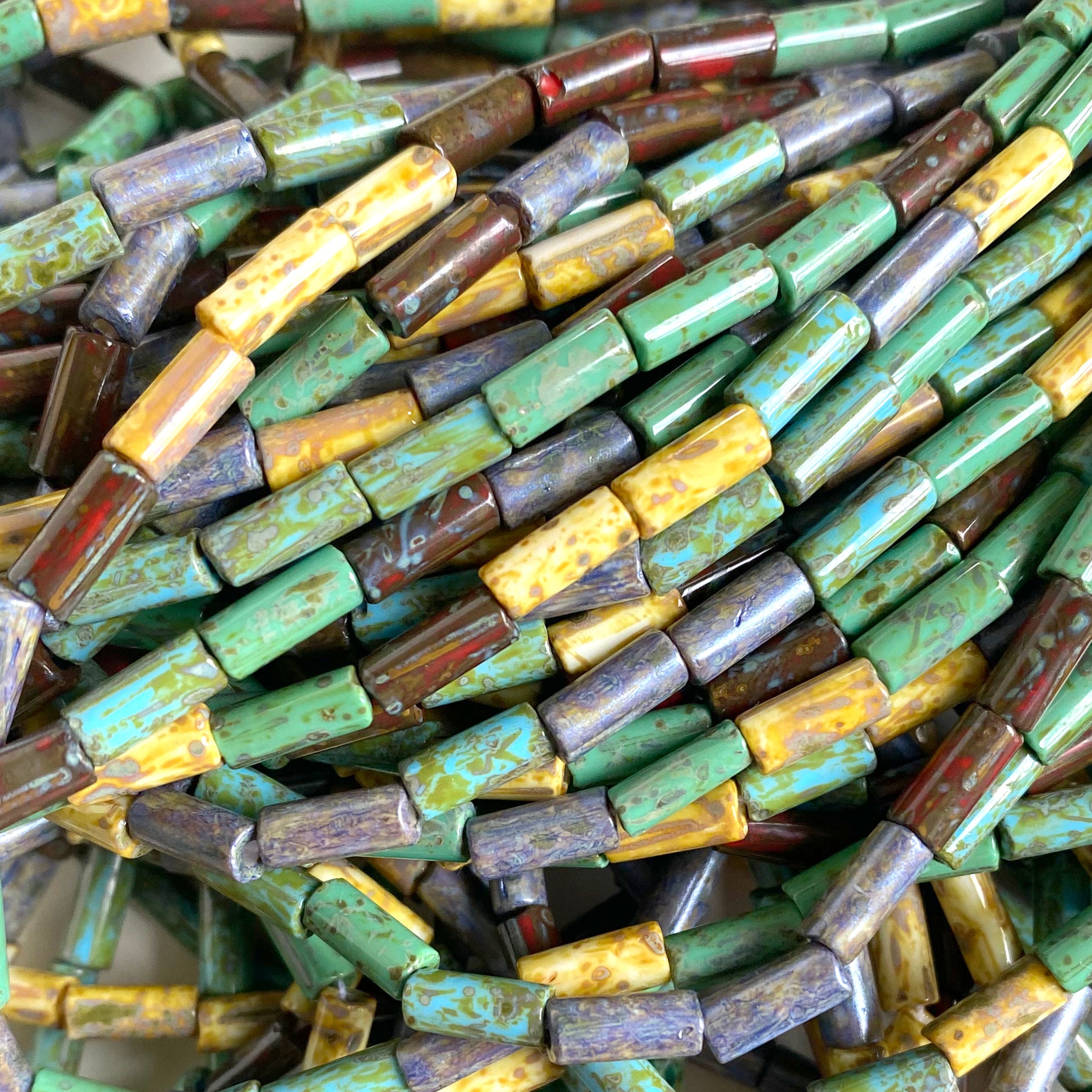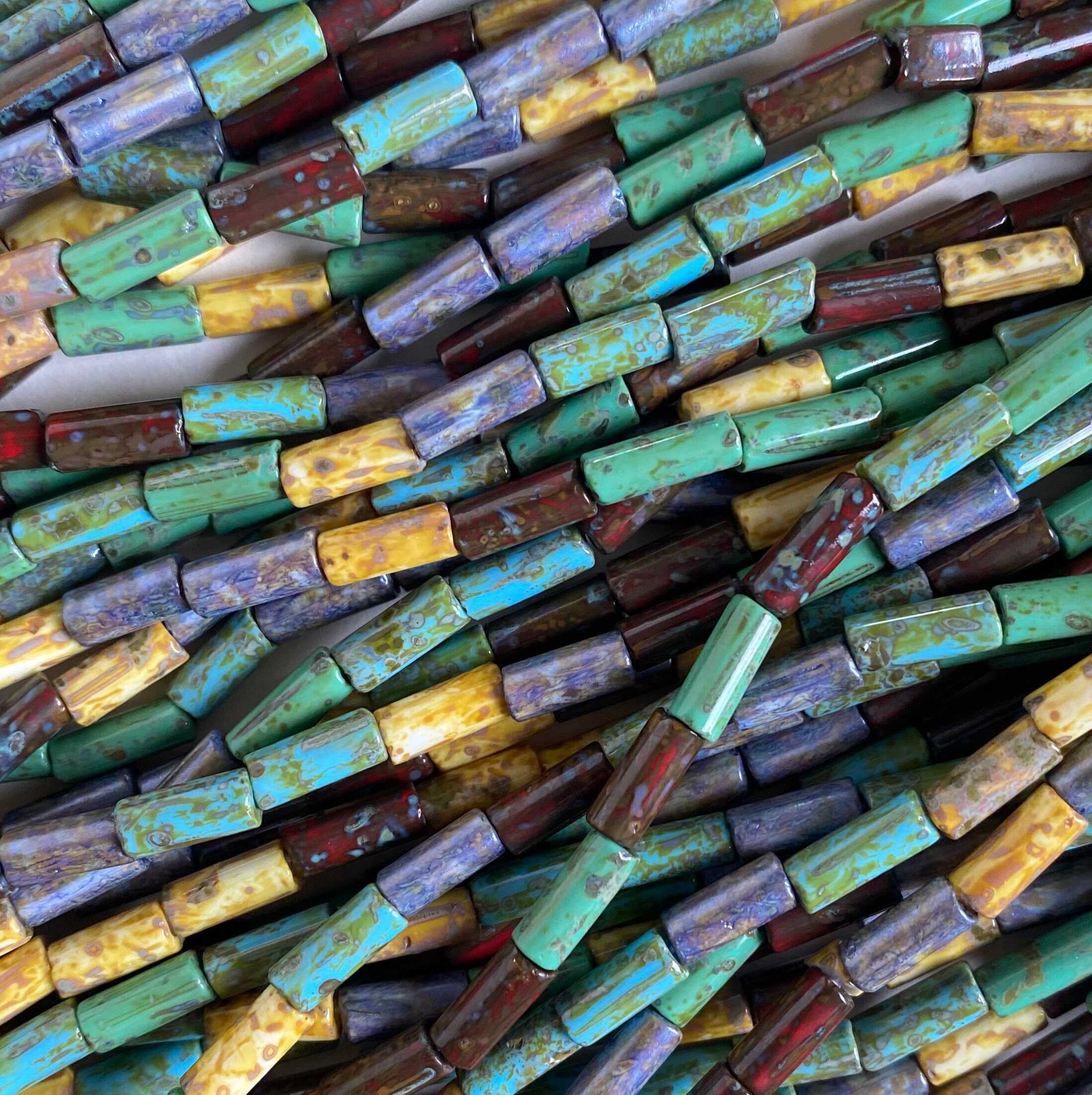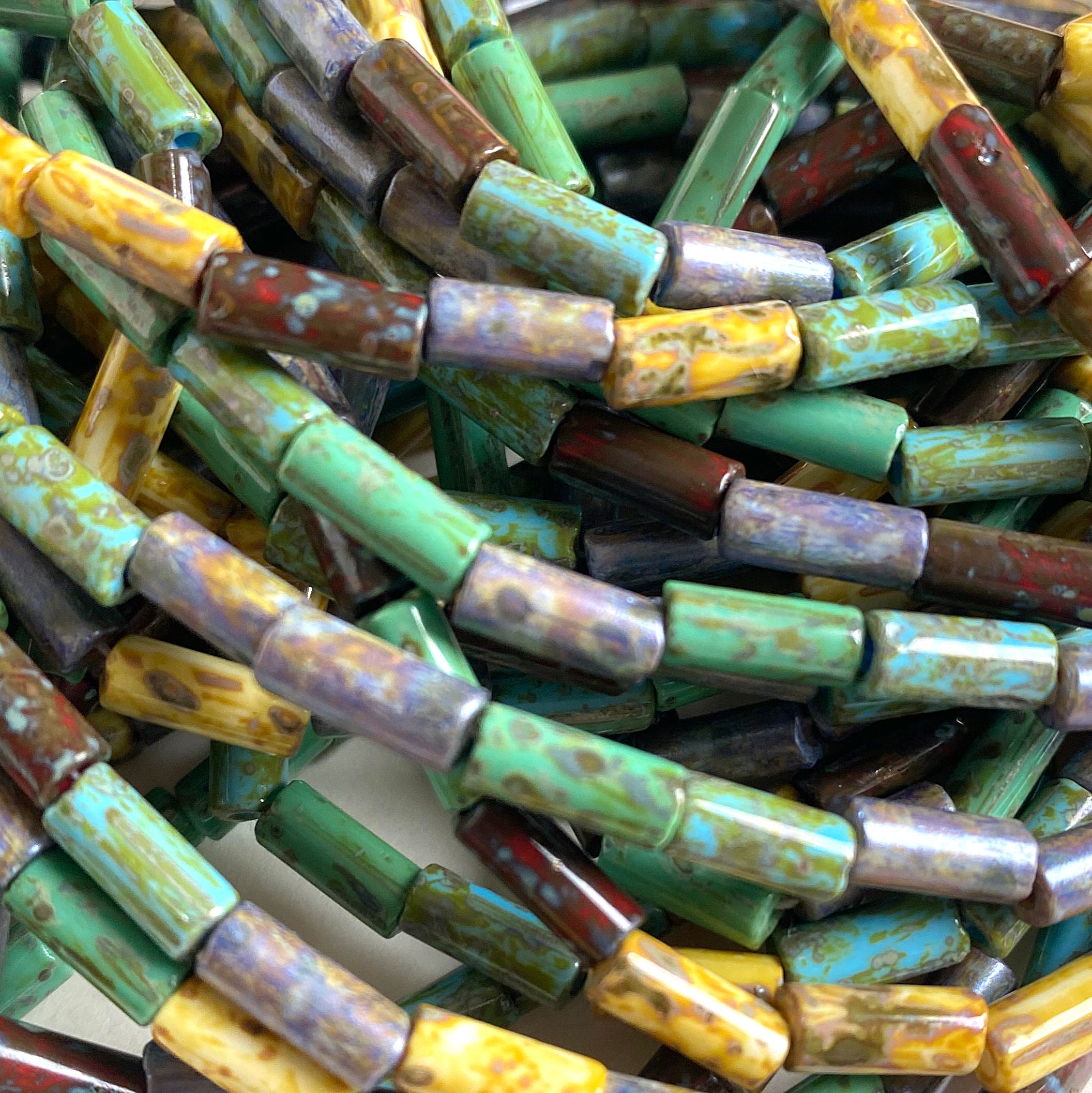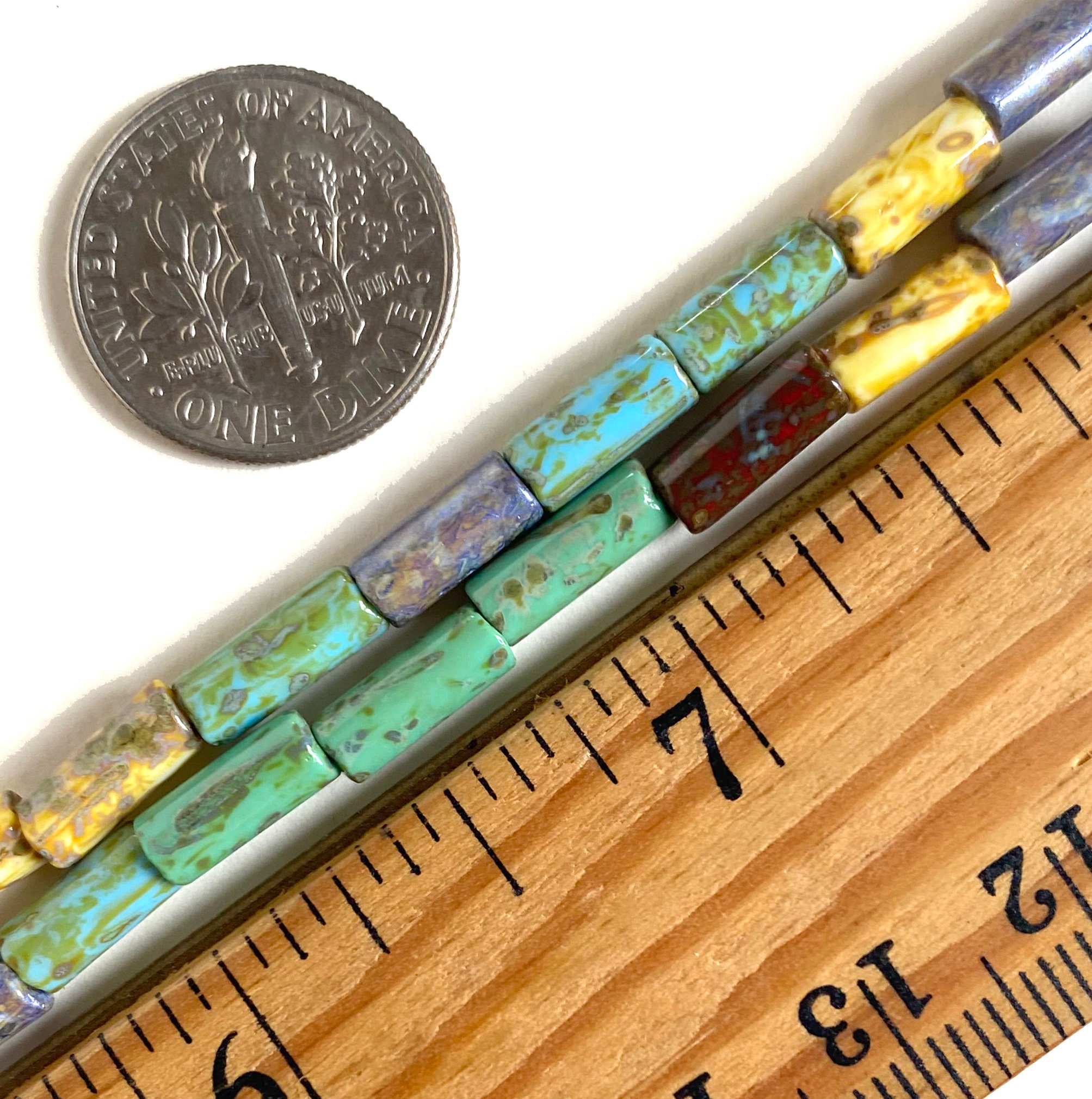 Just arrived! New batch of beautiful aged beads with a rustic finish, aka wampum beads, tribal beads, ethnic beads, trade beads, boho beads... whatever you want to call these, they are sure to add interest to all of your projects! Base colors of silver, red, white, turquoise blue and turquoise green. These are rustic cut with length and size variations adding an organic look. This color blend matches the most recent batch in colors as my last one.