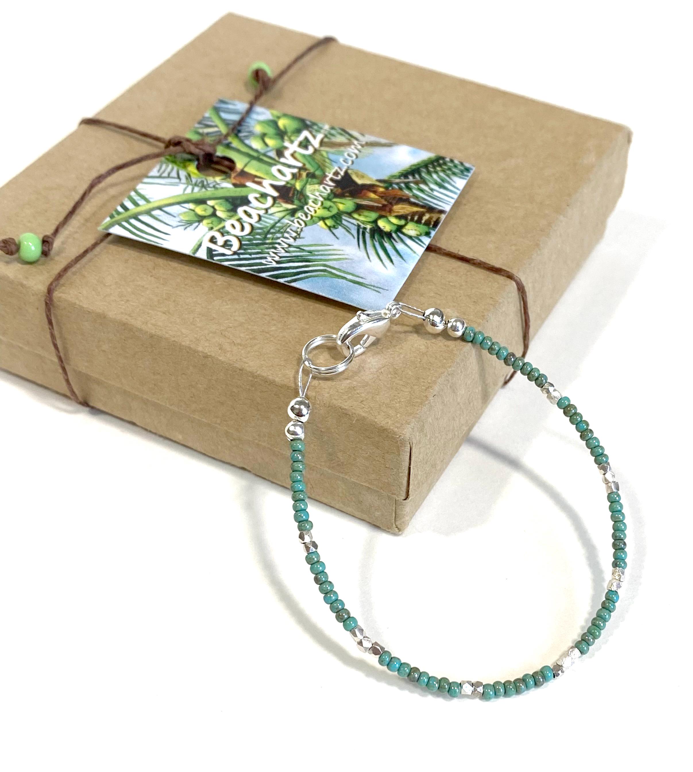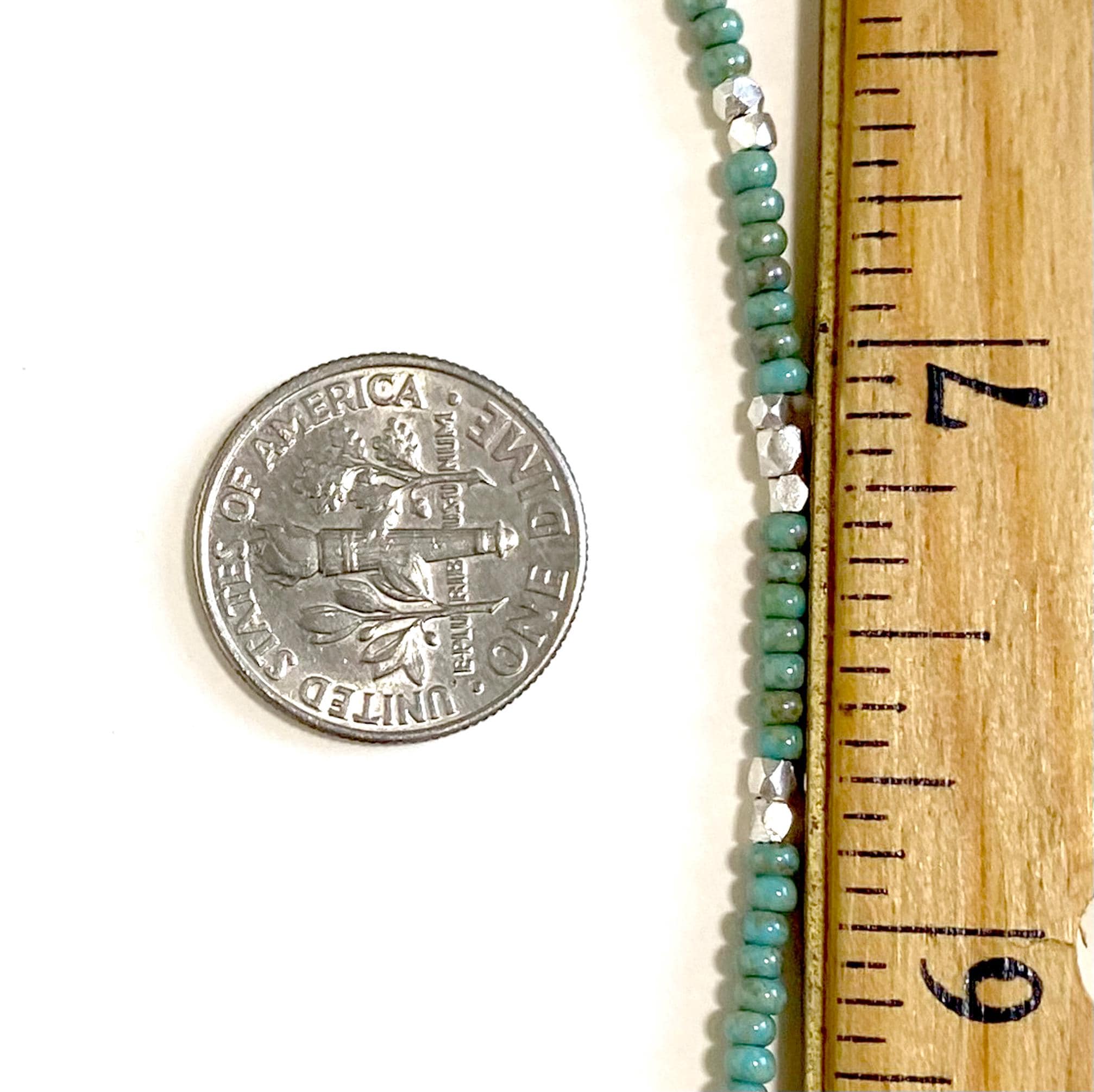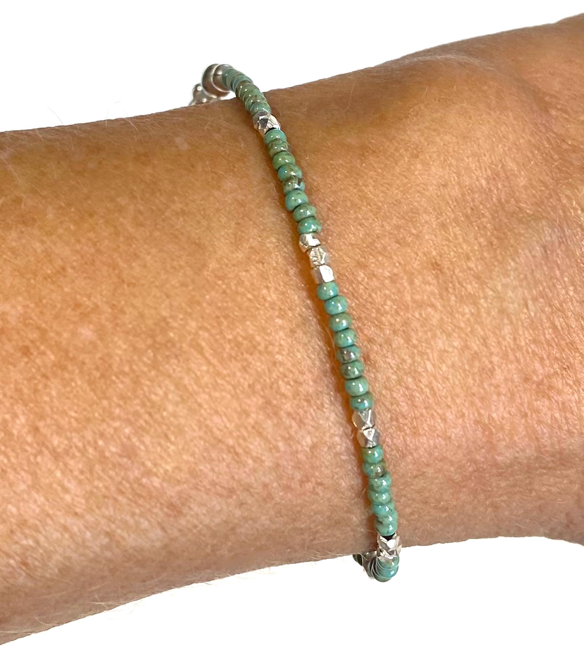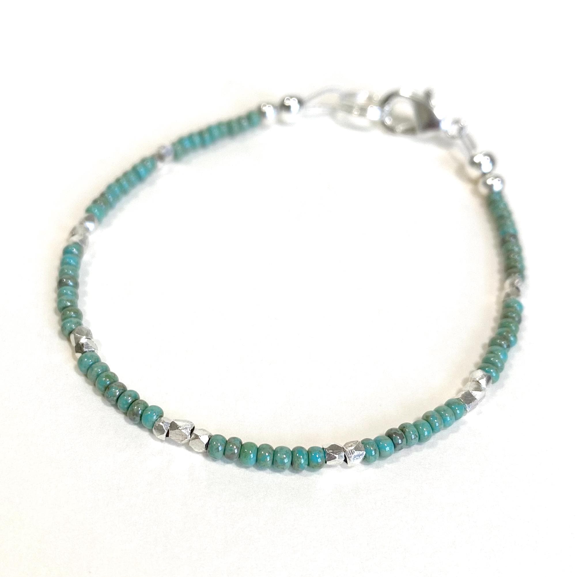 Perfect Boho or Beach style. Tiny turquoise green picasso Czech glass beads with Sterling Silver nugget beads. Custom made to your perfect length. Ready to gift, this bracelet set comes gift wrapped/boxed at no extra charge. Ships Free to the U.S. and Puerto Rico.