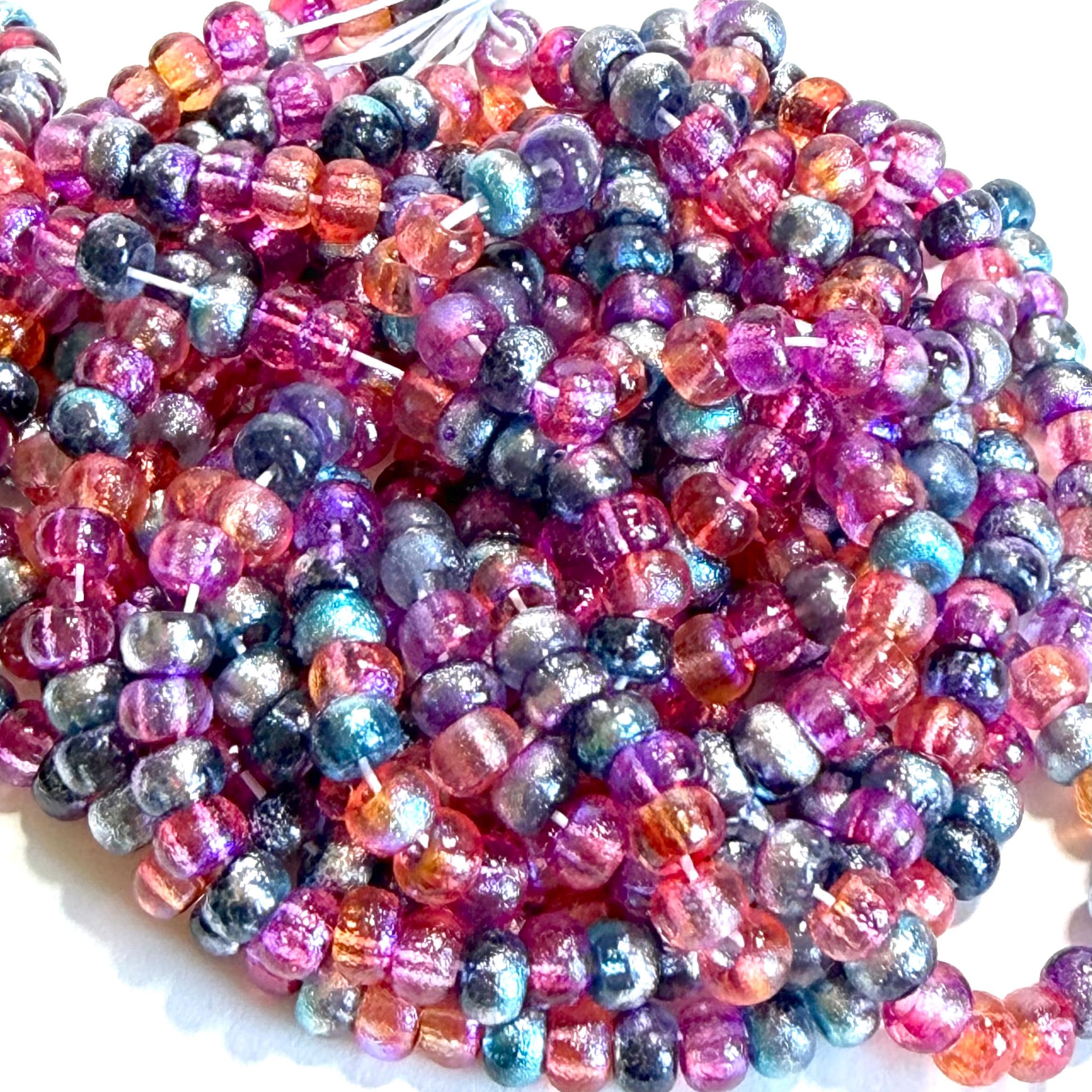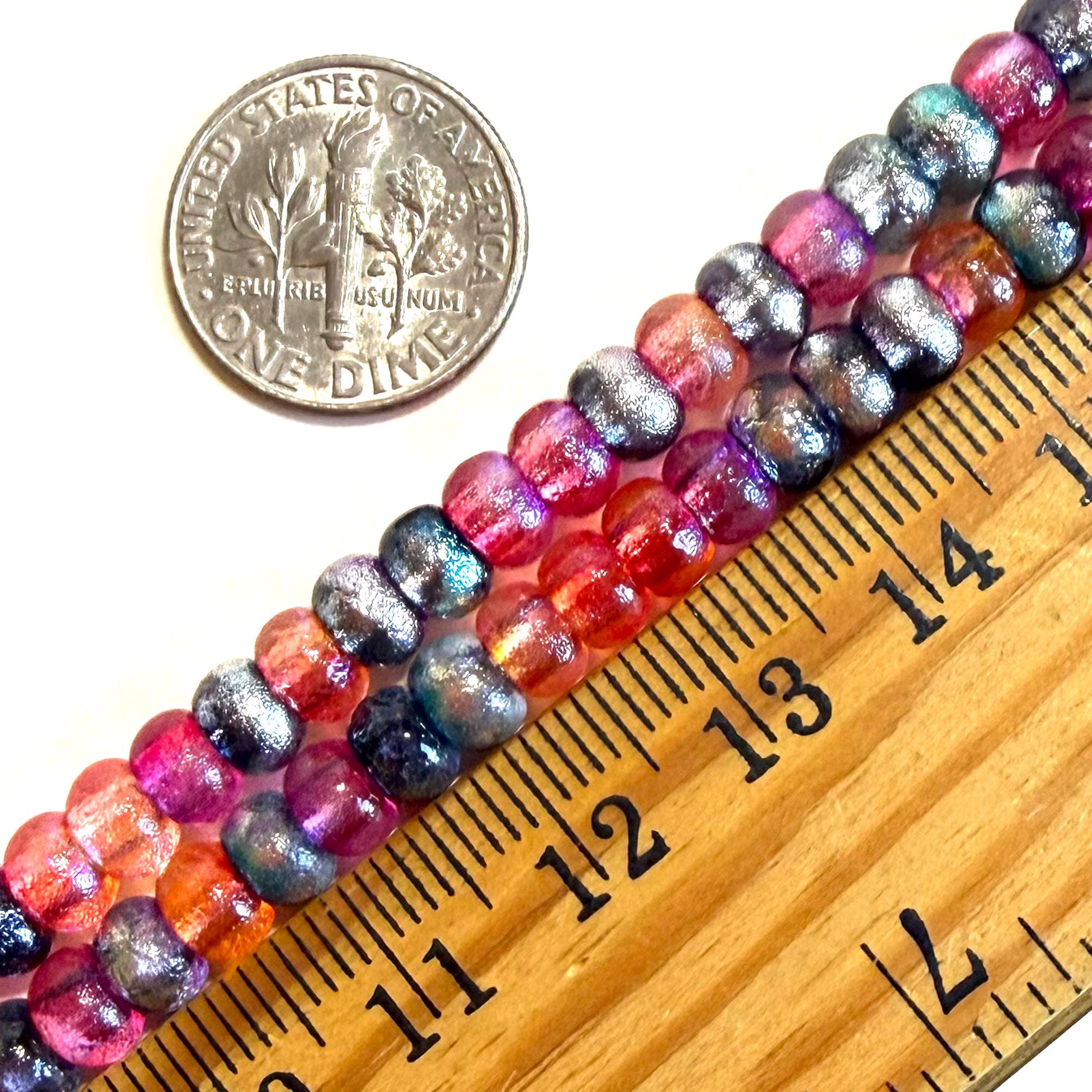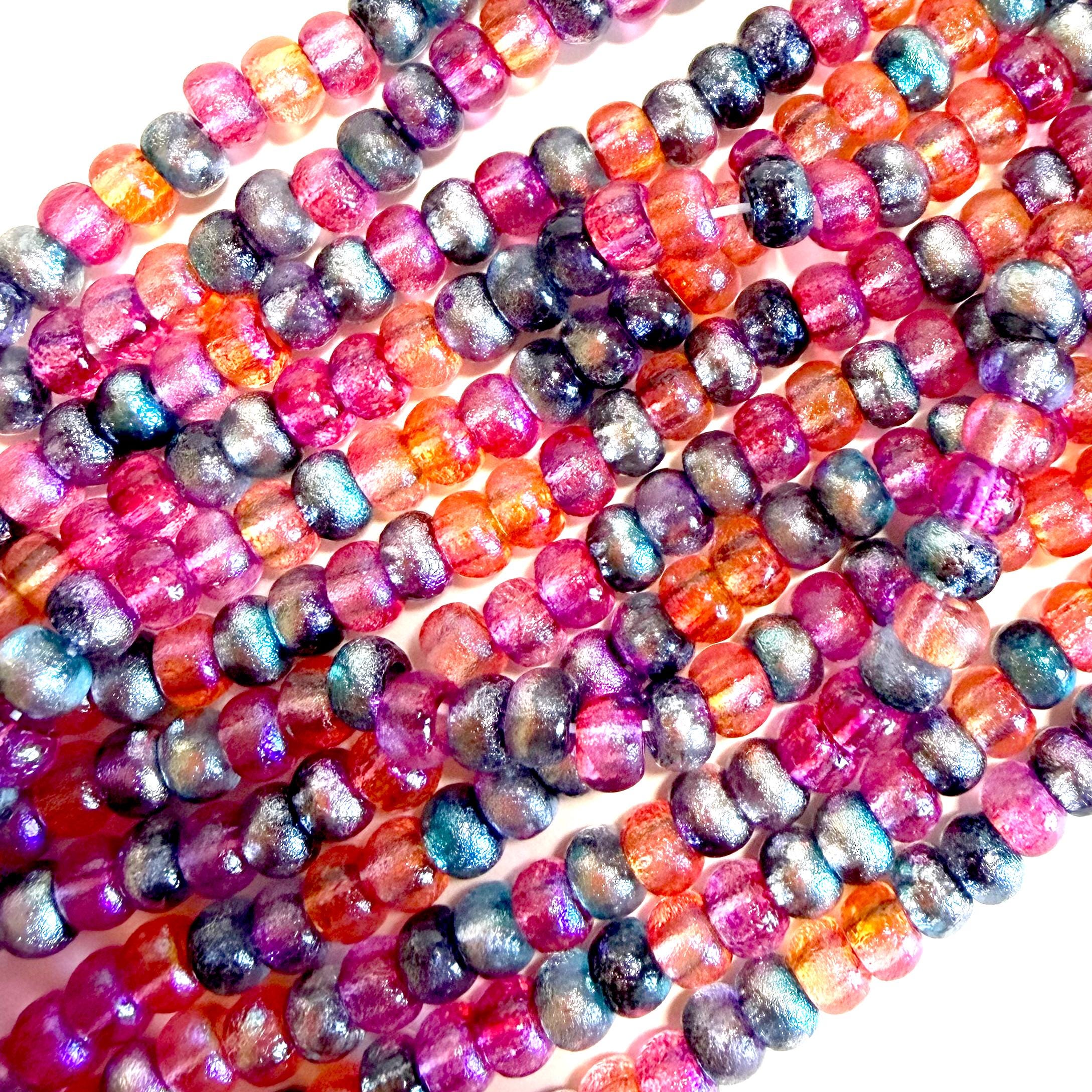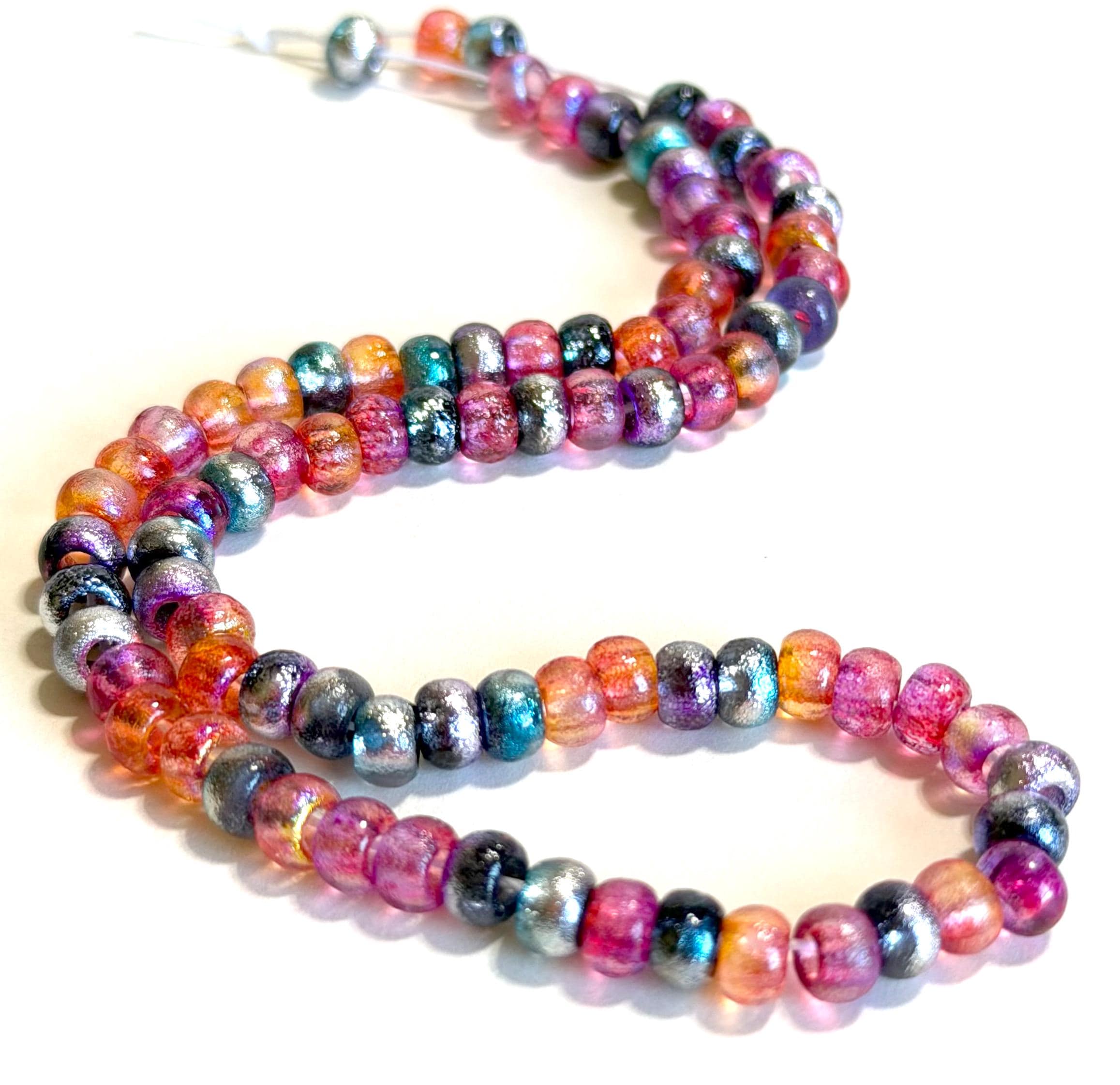Etched textural finish with a range of silver splashes of color. Some purple, some blue, some translucent in pink and orange. Stunning sunset colors. Large Seed beads great for jewelry, macrame and more. As with all bead mixes, there is some size variation.