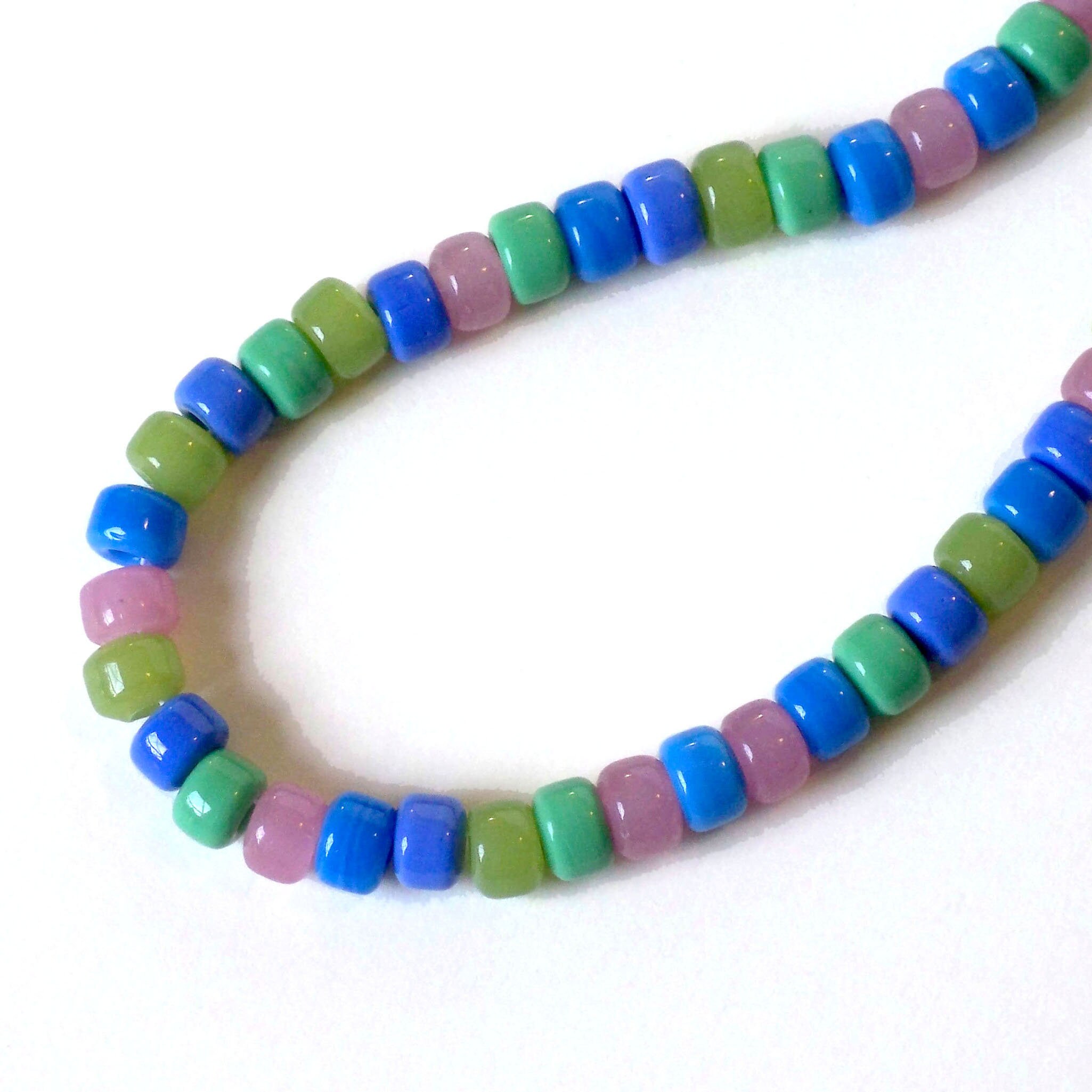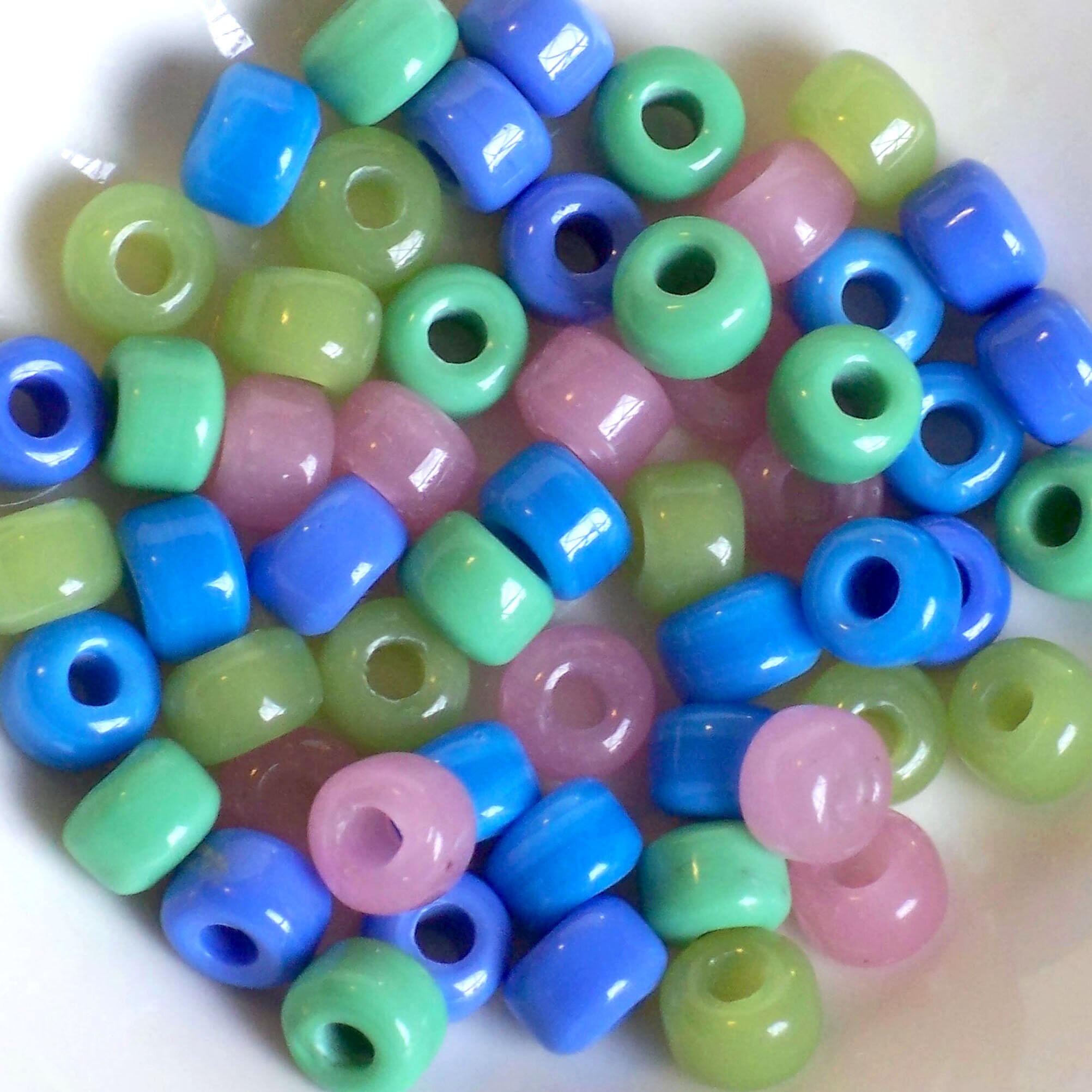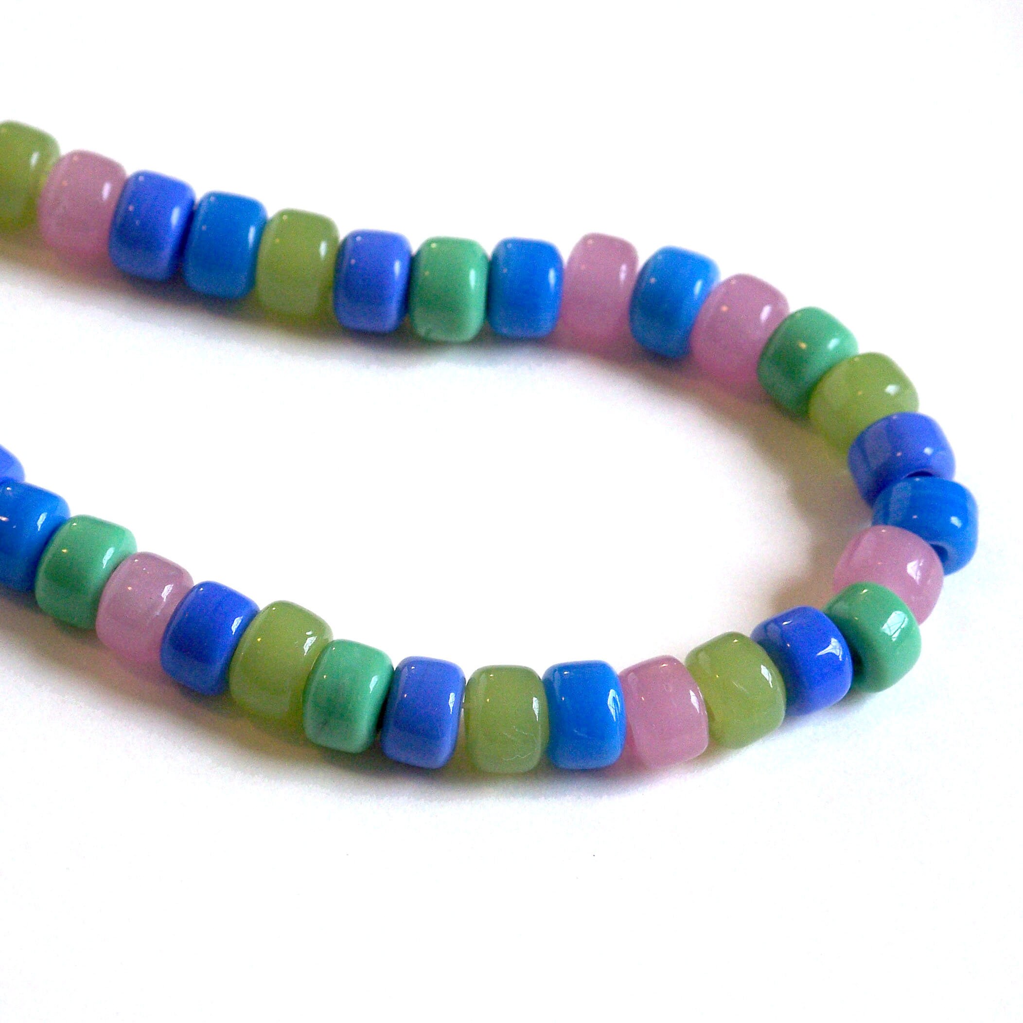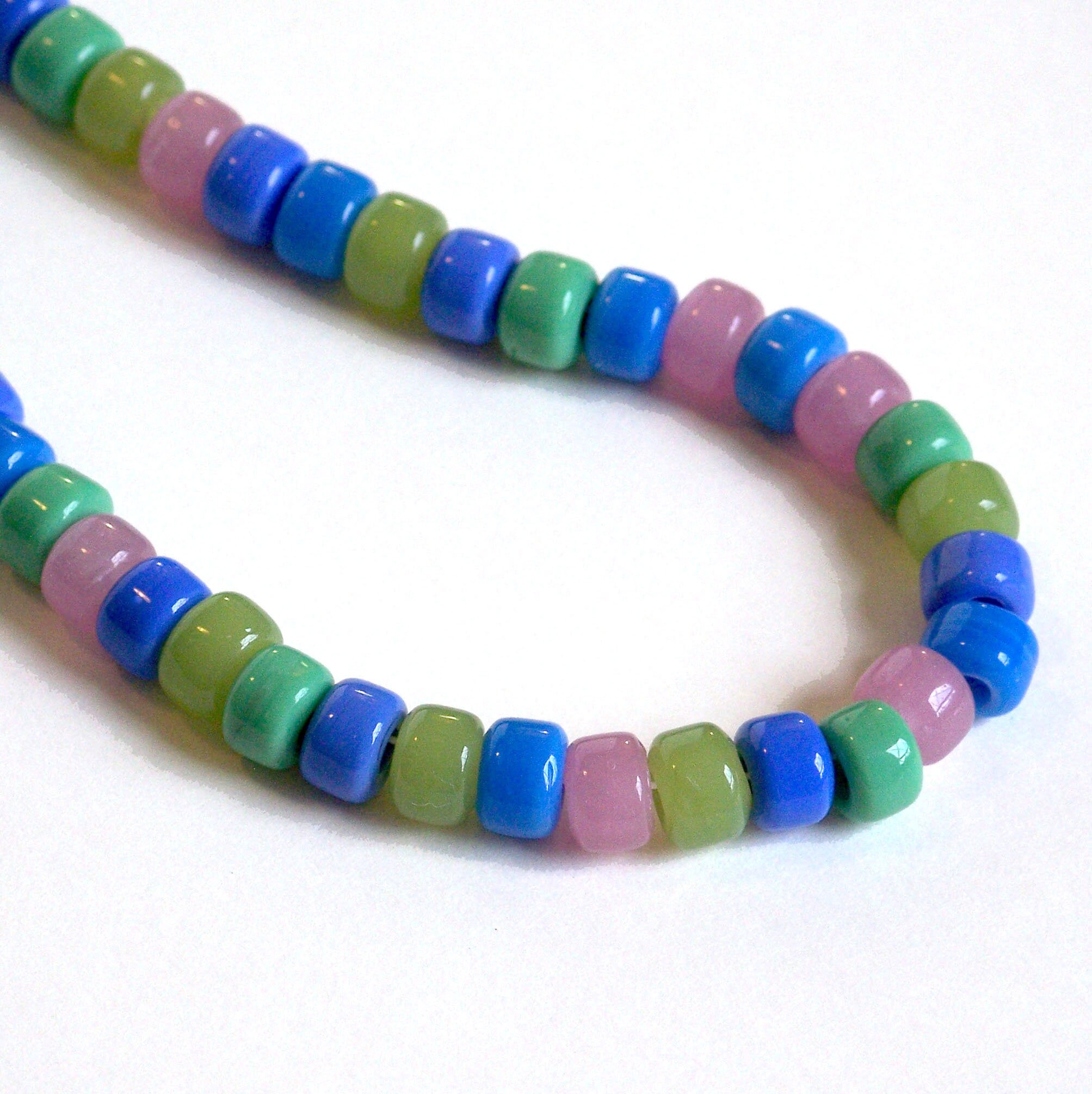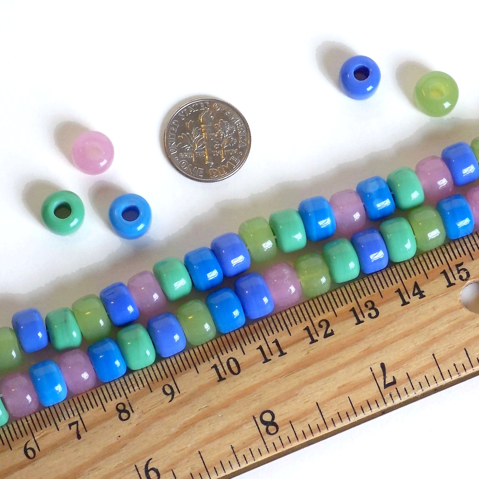 Large hole beads in a new color mix! Perfect for macrame, hemp crafts, jewelry, hair beads and so much more. Blue and Green Opaques combine beautifully with Green Apple and Pink translucent Opal glass beads. These handmade, hand cut beads and, as with all mixes, there is normally some variation with the bead and hole sizes.